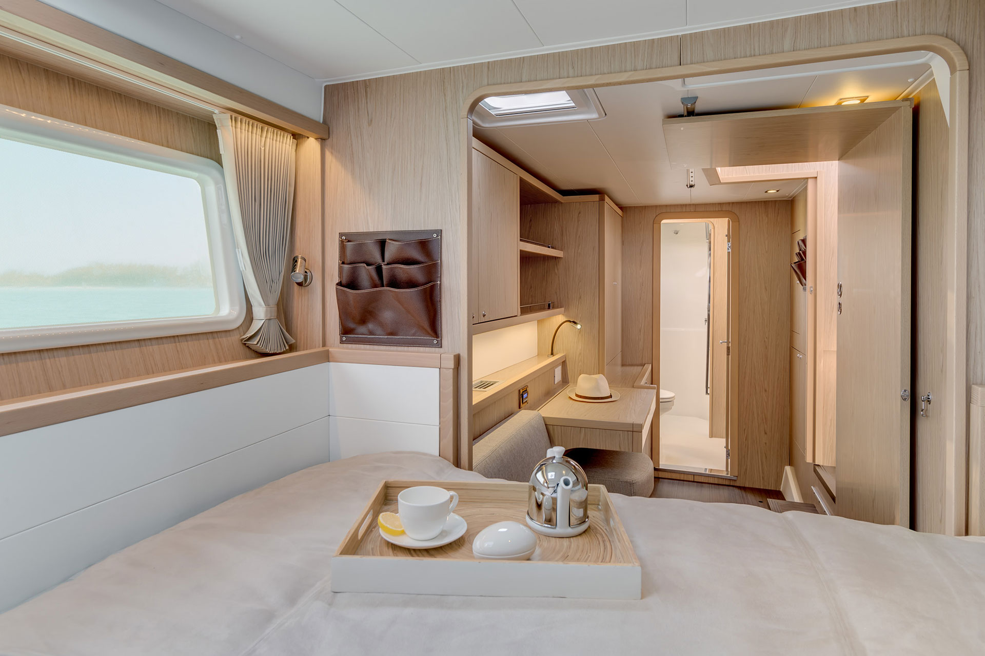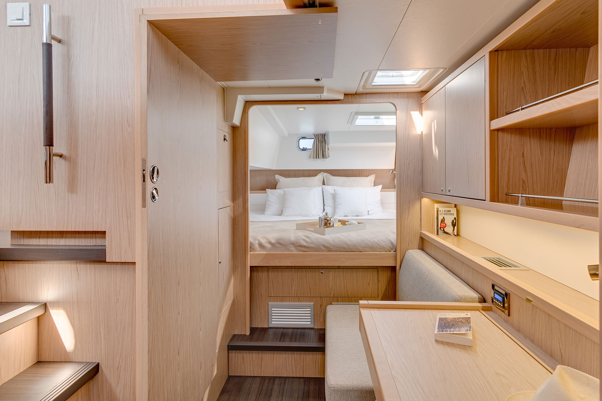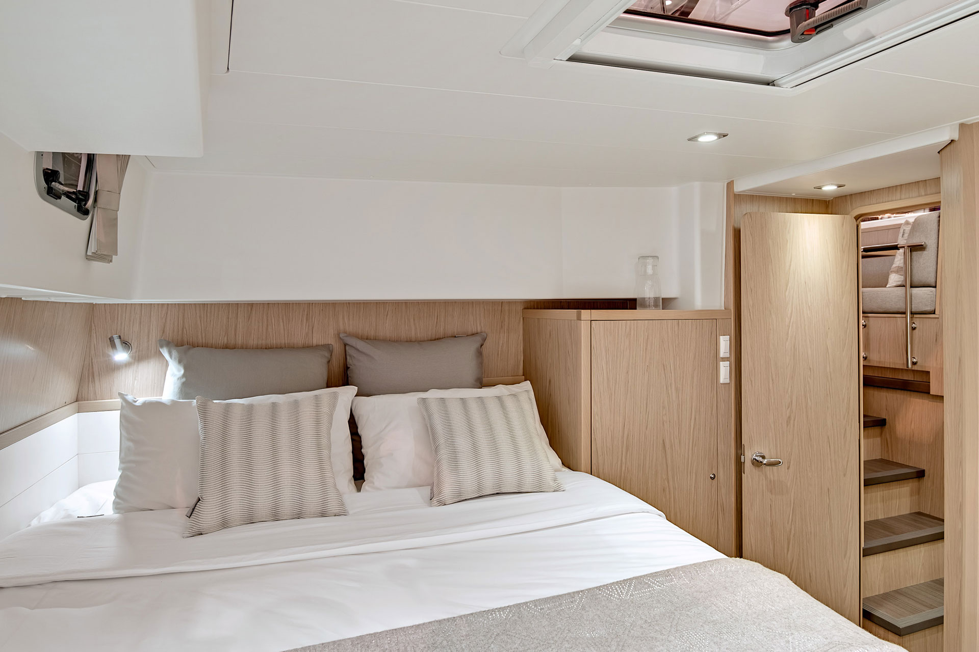 Στο κατάστρωμα, μπορείτε να κυκλοφορήσετε με ασφάλεια από το πίσω τμήμα του σκάφους στο μπροστινό μέρος του χάρη στα πλαϊνά καταστρώματα. Στο εσωτερικό, όλα είναι καλά μελετημένα και βελτιστοποιημένα δημιουργώντας ένα εργονομικό και πολυτελές σύνολο.
