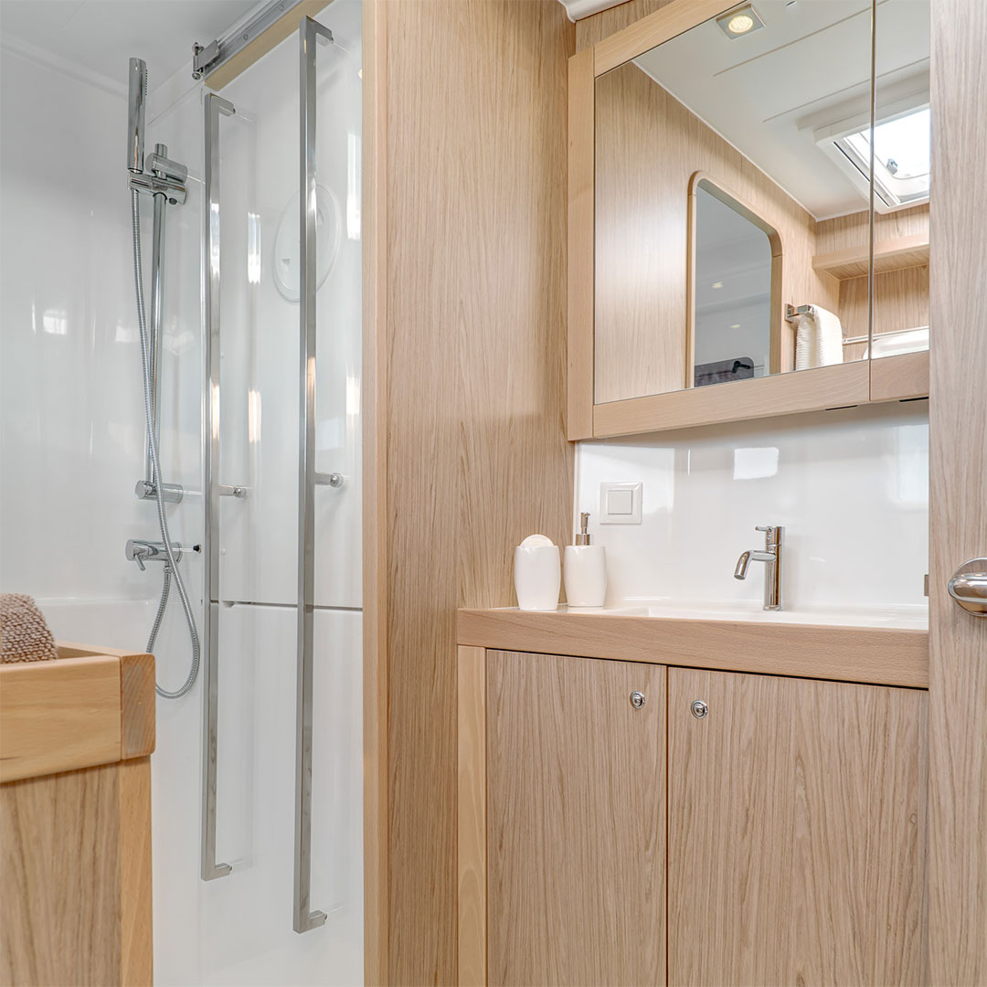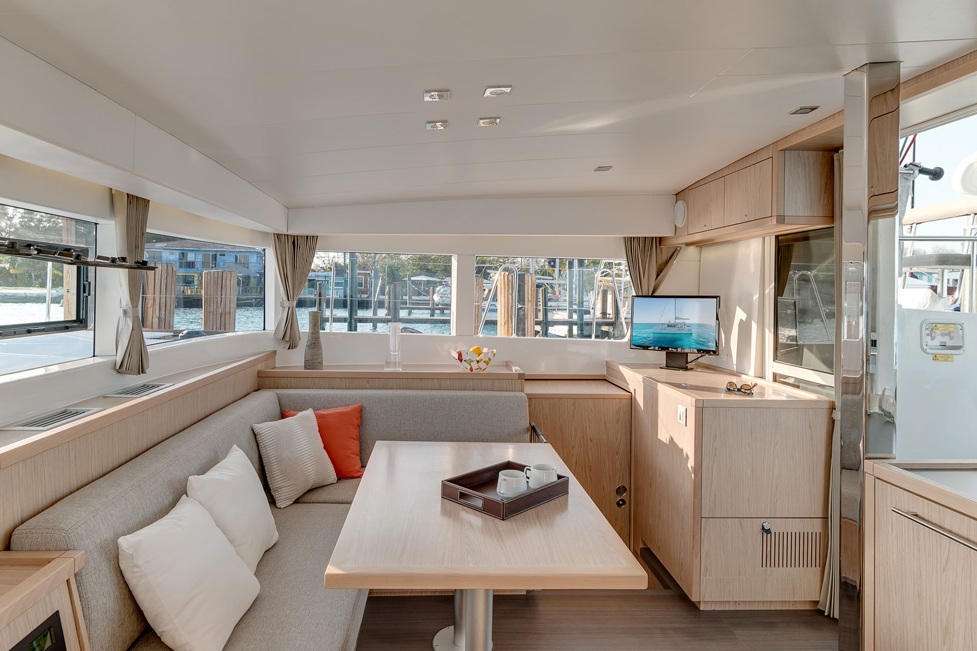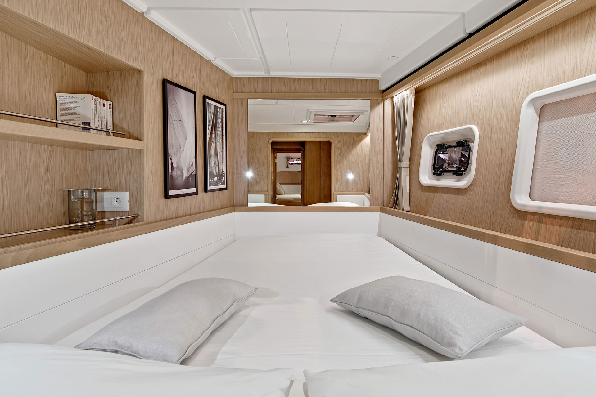 Στο κατάστρωμα, μπορείτε να κυκλοφορήσετε με ασφάλεια από το πίσω τμήμα του σκάφους στο μπροστινό μέρος του χάρη στα πλαϊνά καταστρώματα. Στο εσωτερικό, όλα είναι καλά μελετημένα και βελτιστοποιημένα δημιουργώντας ένα εργονομικό και πολυτελές σύνολο.